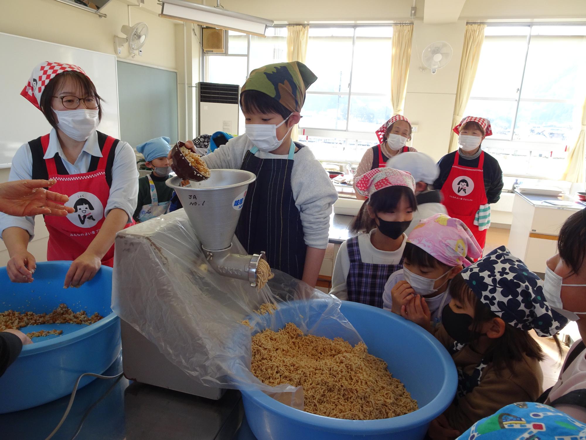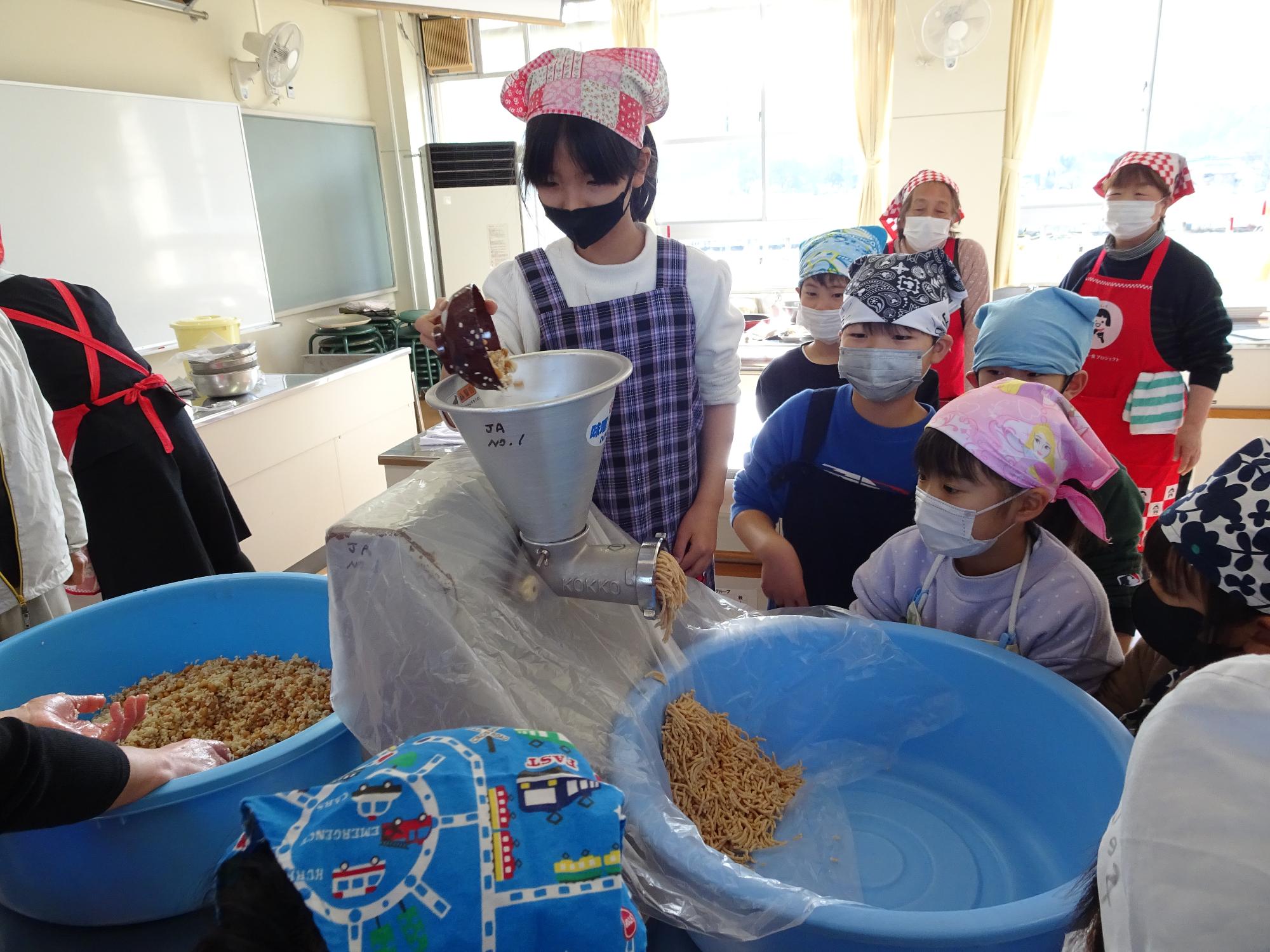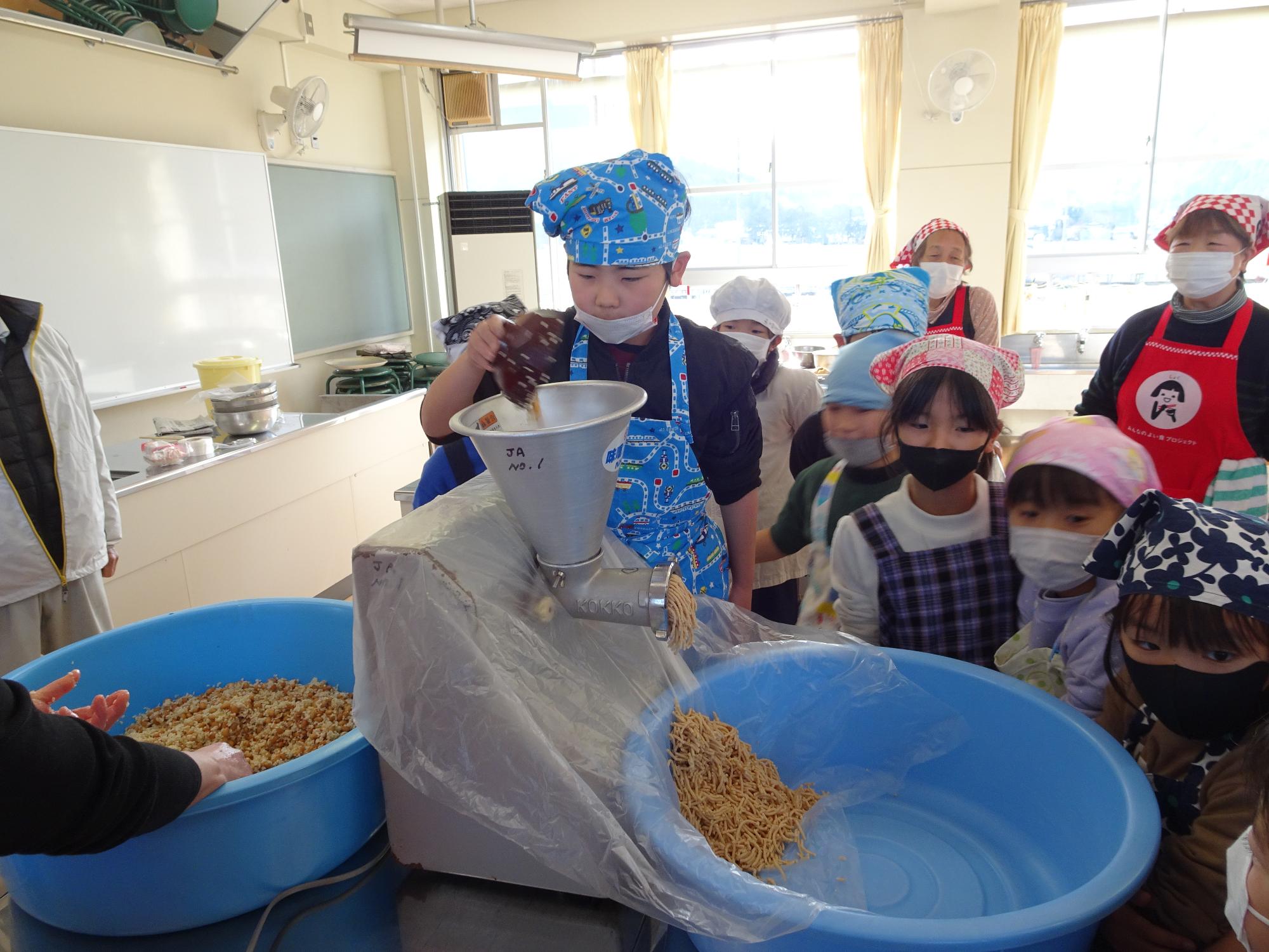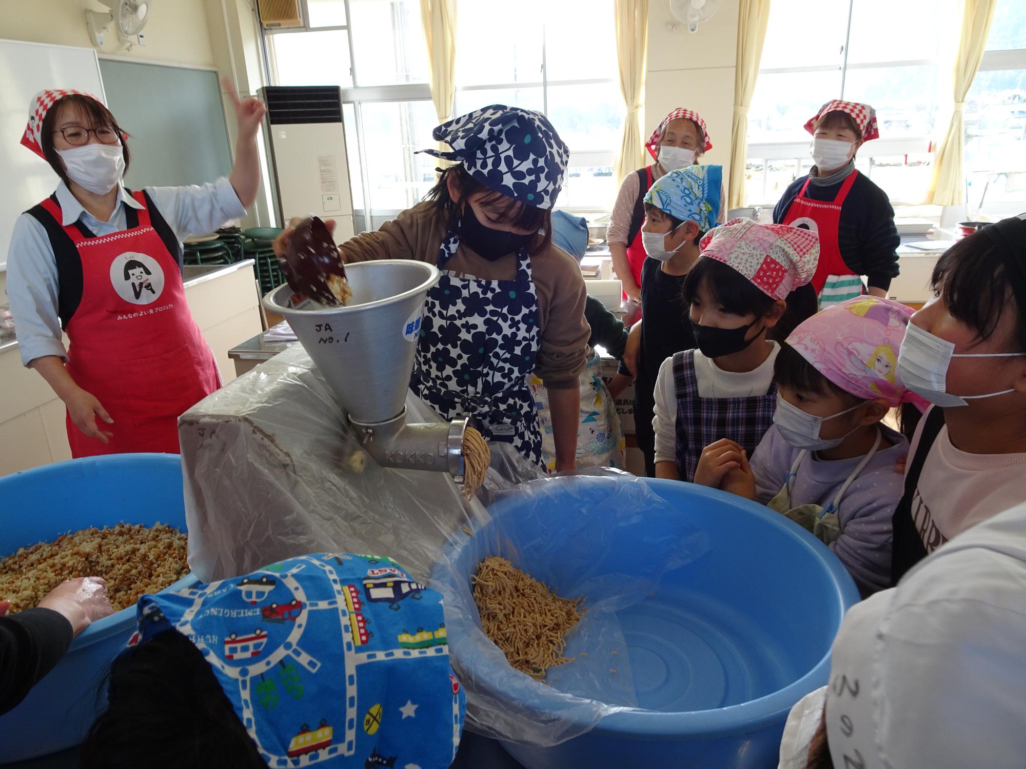 細かく機械で挽きました。ミンチのように混ざって、細かくなって機械から出て来る様子にみんなくぎ付けでした。
