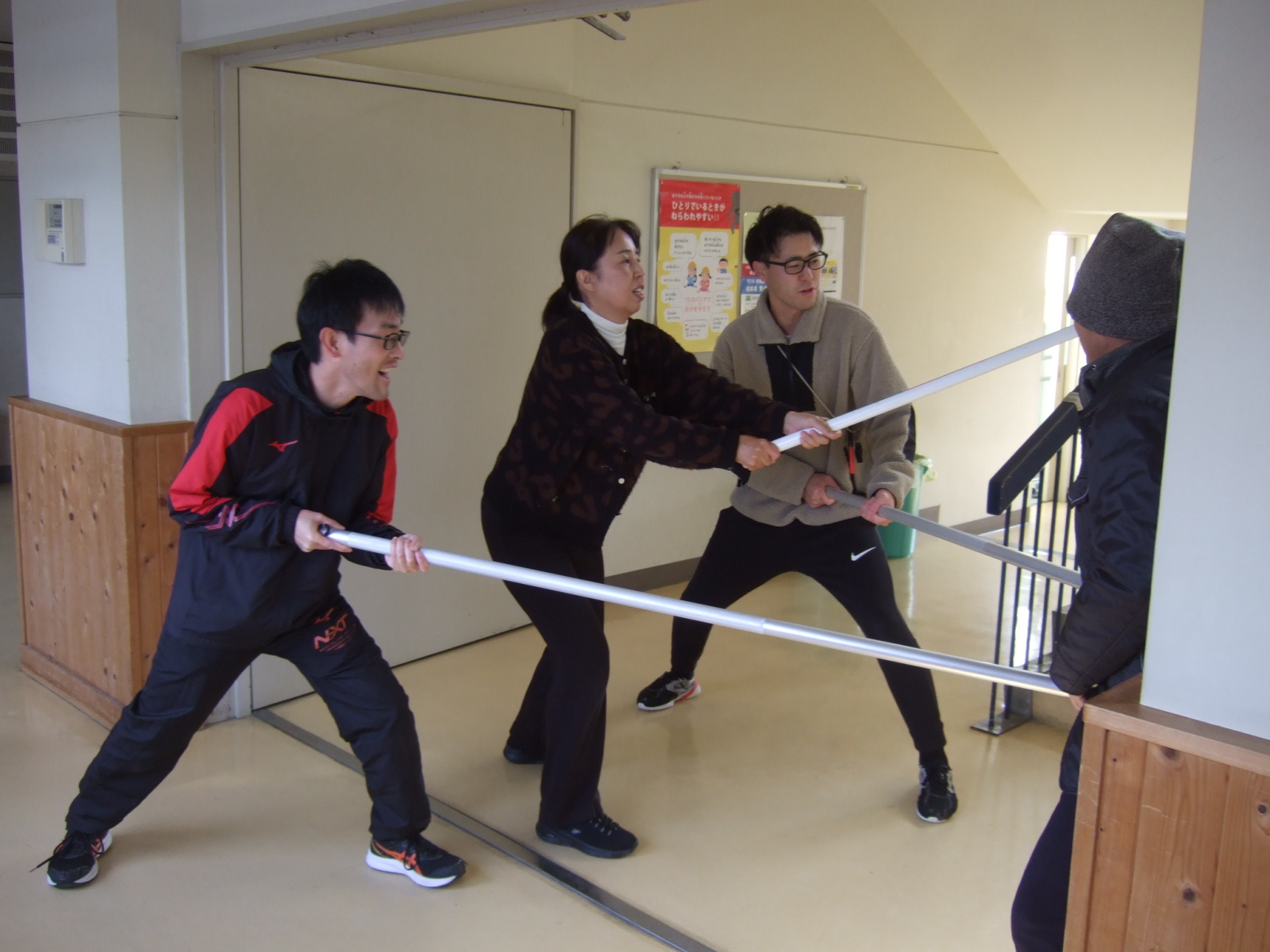 3人の先生が集まって、2階には行かせまいと奮闘中です。