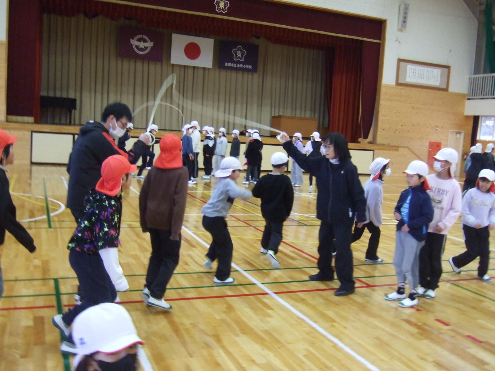 今日は、体育館で全校そろって大繩練習です。先日、東野開発振興会より子どもたちのためにと買っていただいた、大縄跳び(ロープ)を使って練習です。