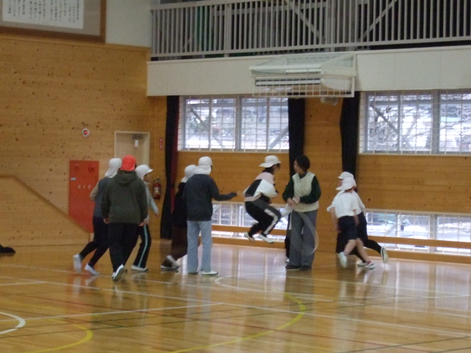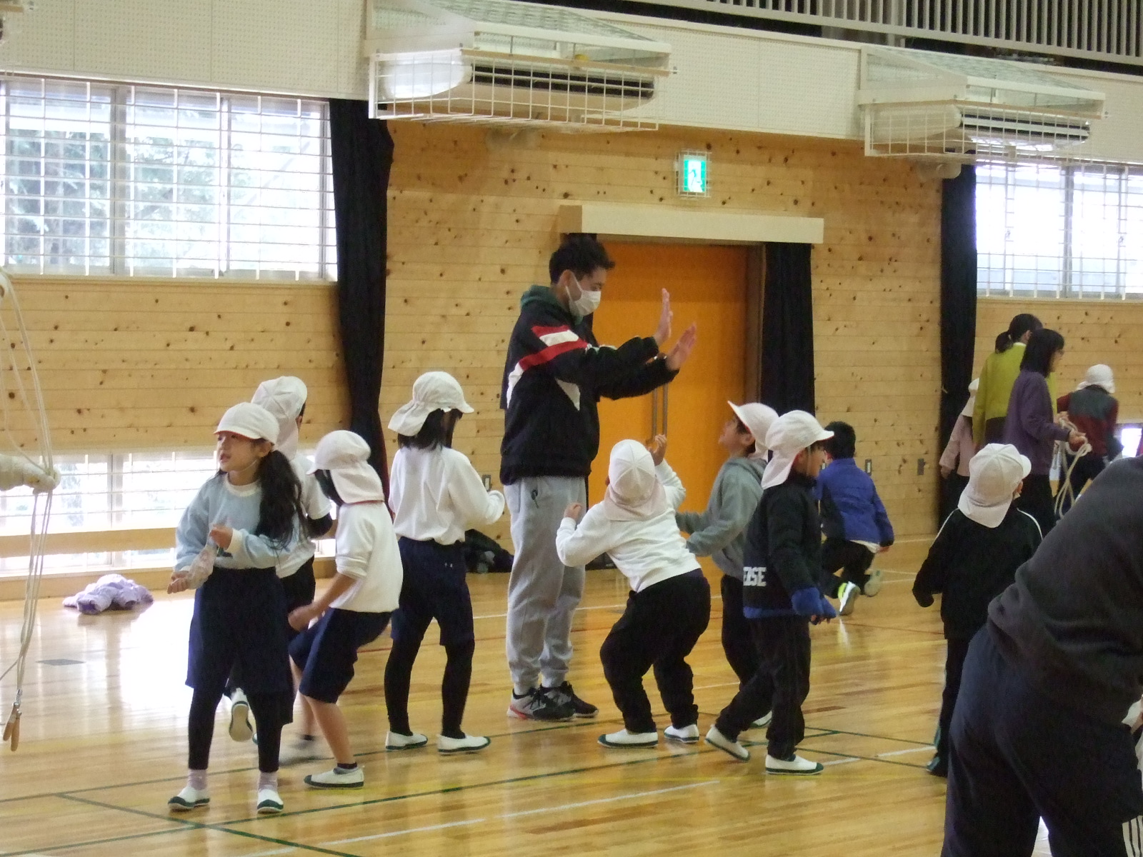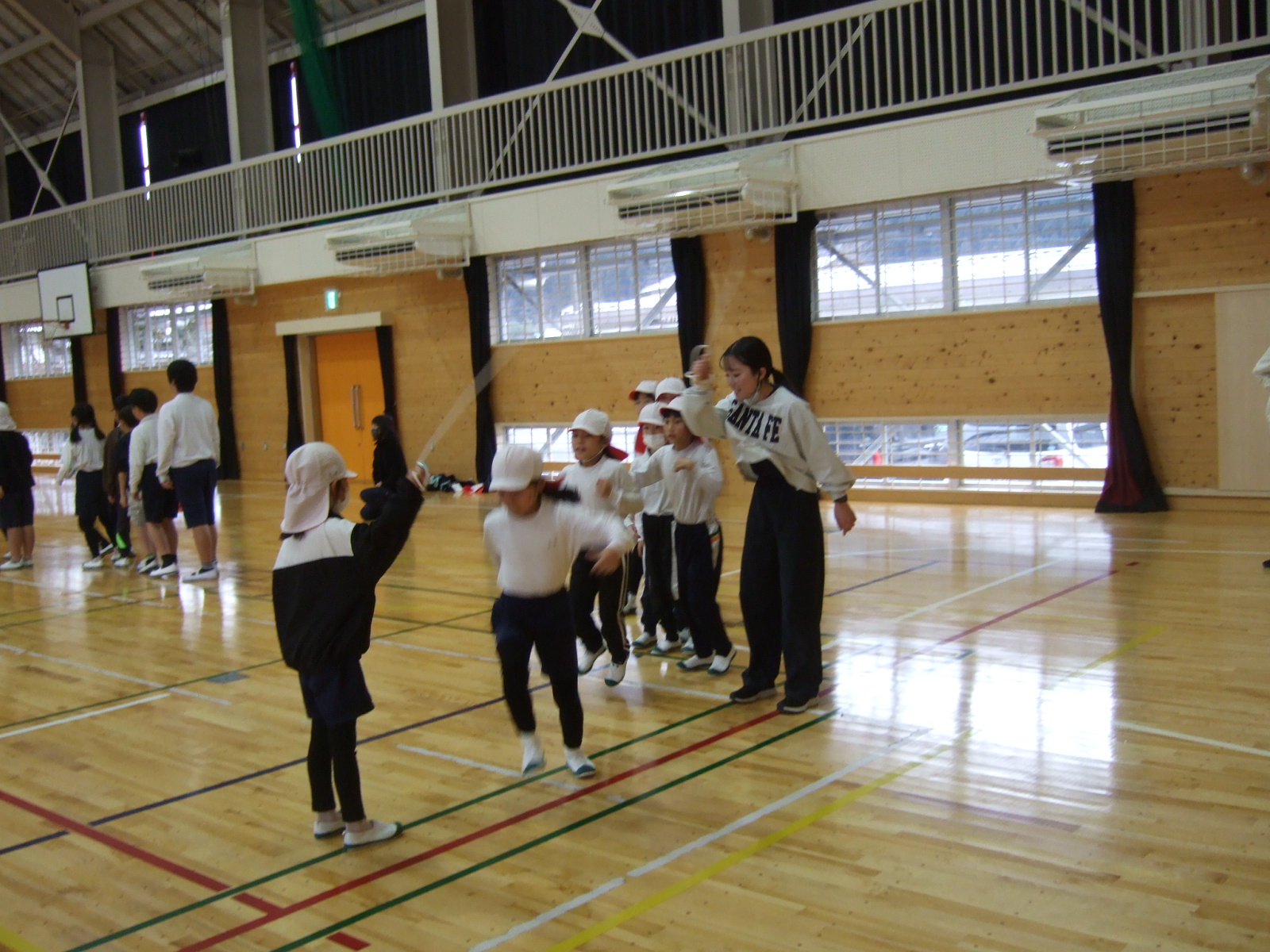 担任の先生の所に集まってきて、ハイタッチ!!少し前まで、跳べない子がいたのに、頑張れば、頑張るほど伸びる1年生。でした。