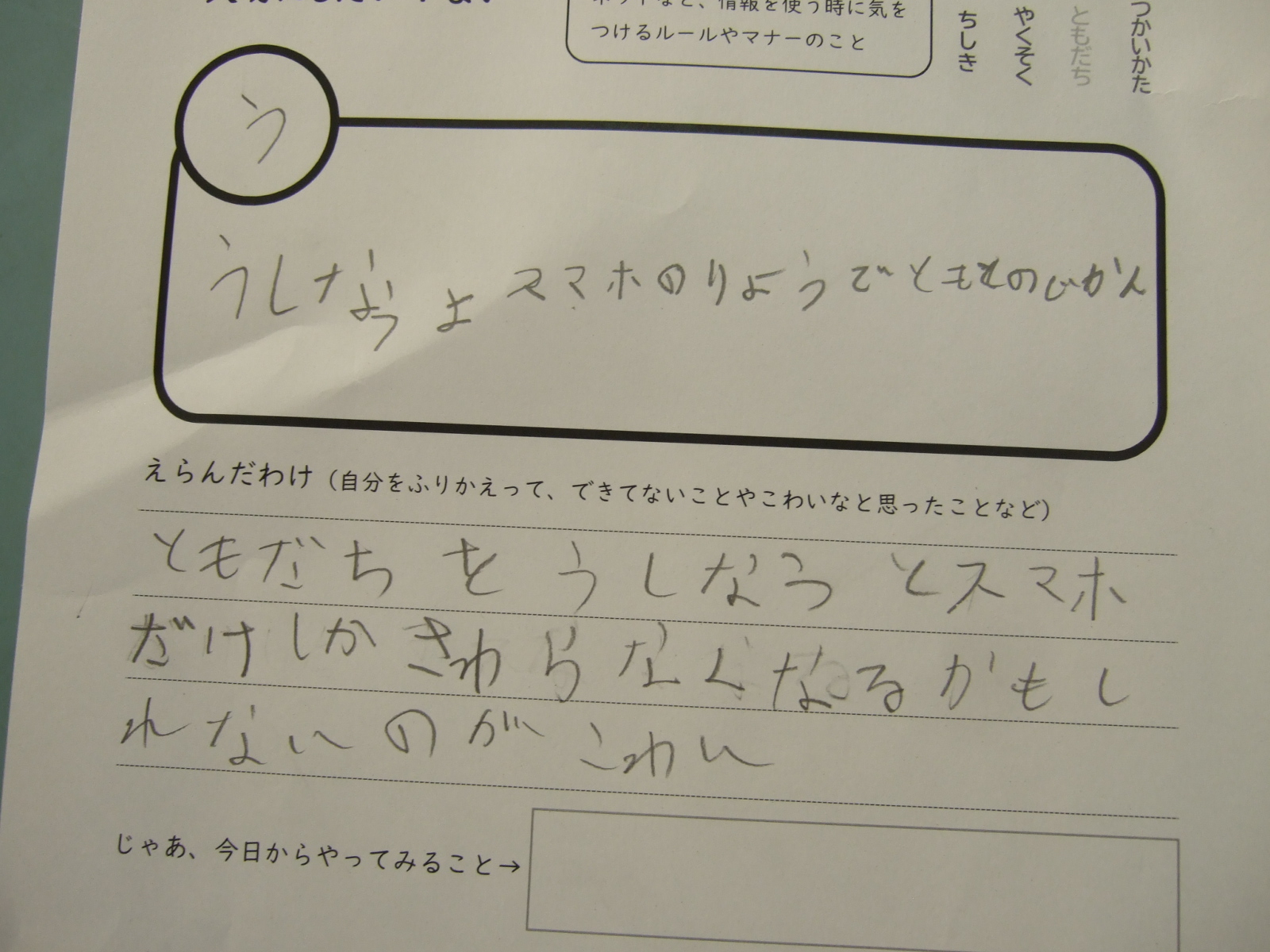 「うしなうよ スマホの利用で 友との時間」が気になりました。友達を失って、スマホだけしか触らなくなるのが怖いと思いました。