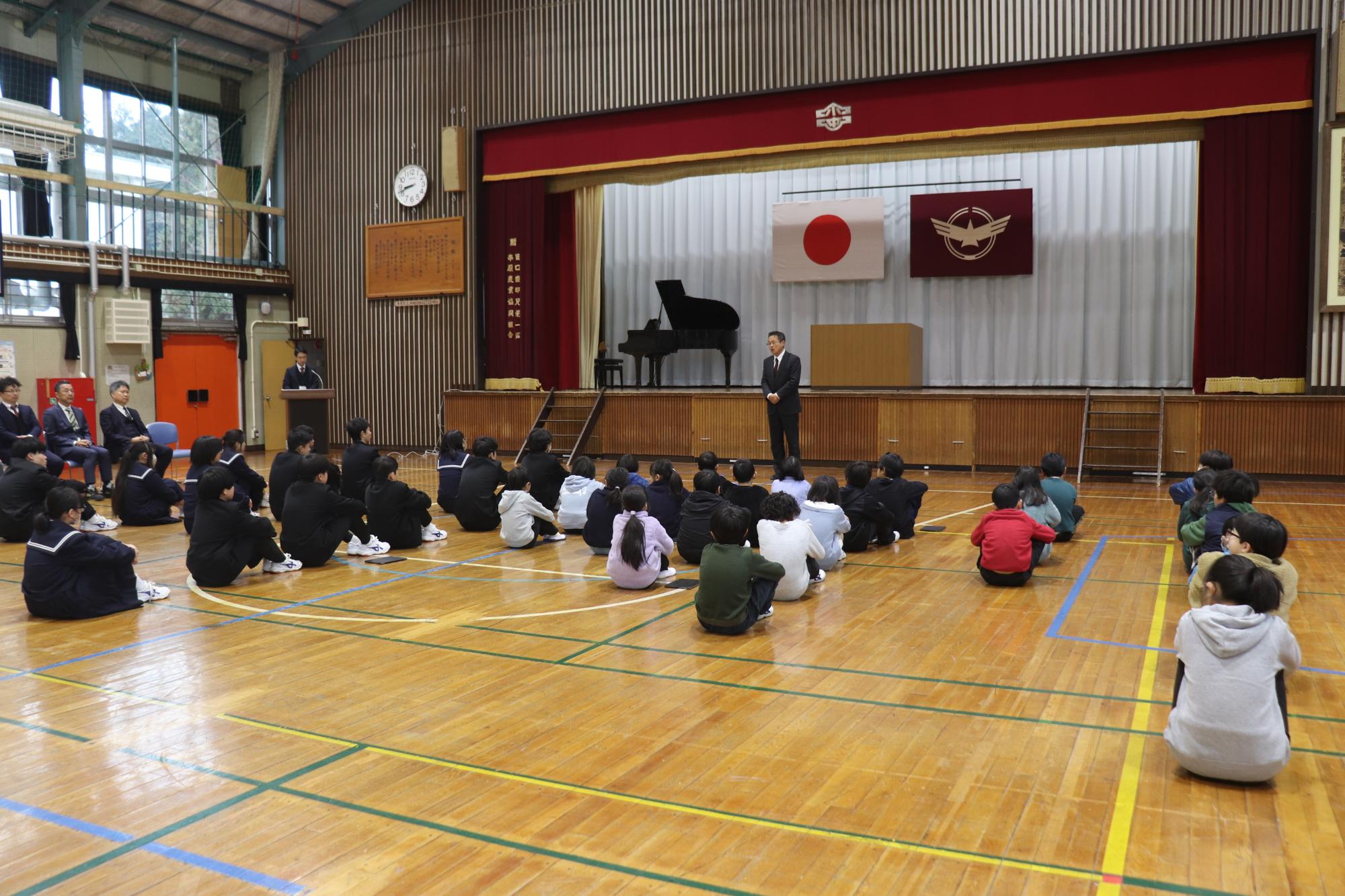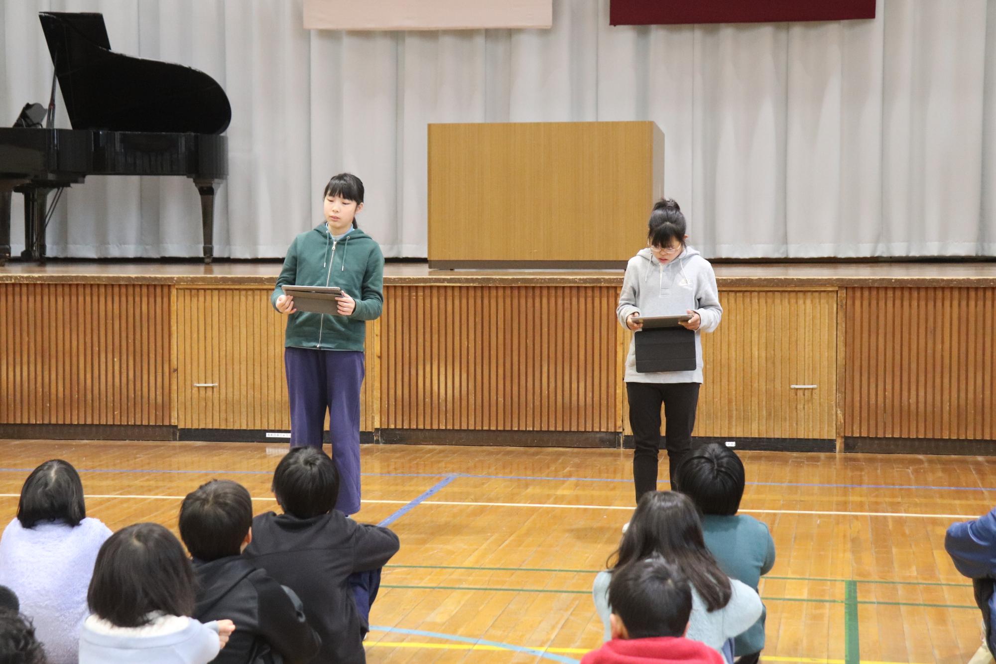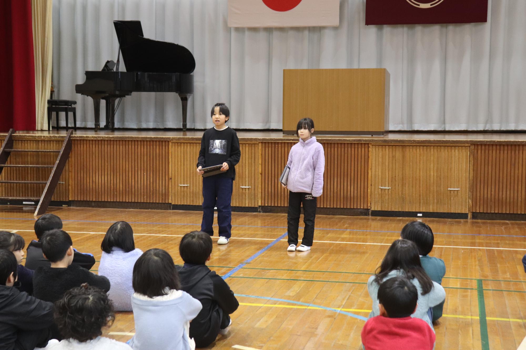 全校集会では、各学年の代表が3学期頑張りたいことを話しました。「相手が嫌な気持ちにならないように思いやりの言葉を使いたい。」など、自信をもって発表する姿がありました。