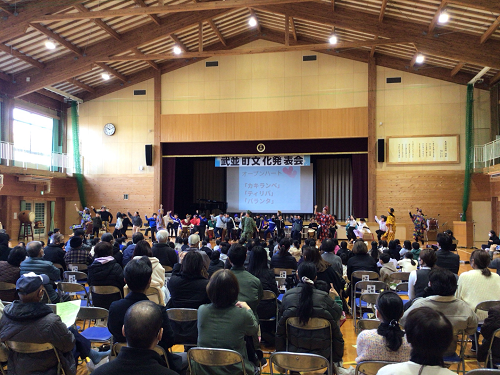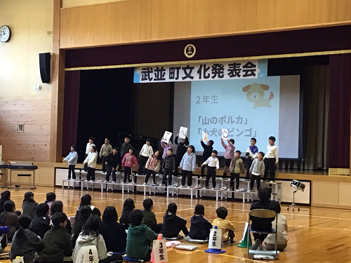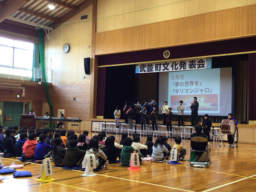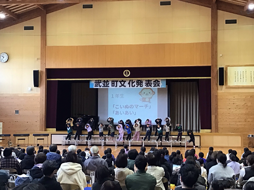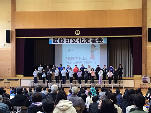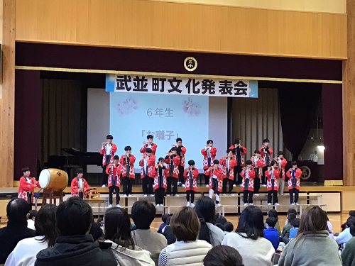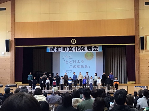 武並町文化発表会が行なわれました。恵那ウインドオーケストラの吹奏楽の演奏や、コーラスやダンスなどの町民のクラブの発表のあと、武並小学校の各クラスの発表がありました。みんな、練習の成果を十分に発揮し、自信をもって発表できました。特に、6年生は、地域の方に1年を通して笛の作成から、音楽のご指導まで関わっていただいた伝統文化の道笛を発表しました。とてもよい発表でした。地域文化のよい担い手として今後も伝統を受け継いでいってほしいです。どの学年も今年度の児童の成長が見られたとてもよい発表会になりました。