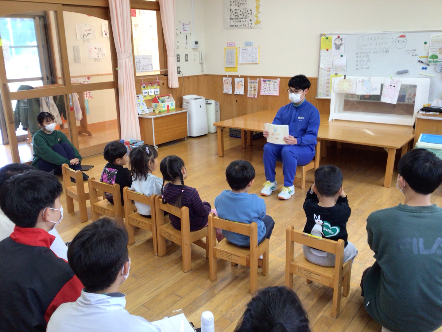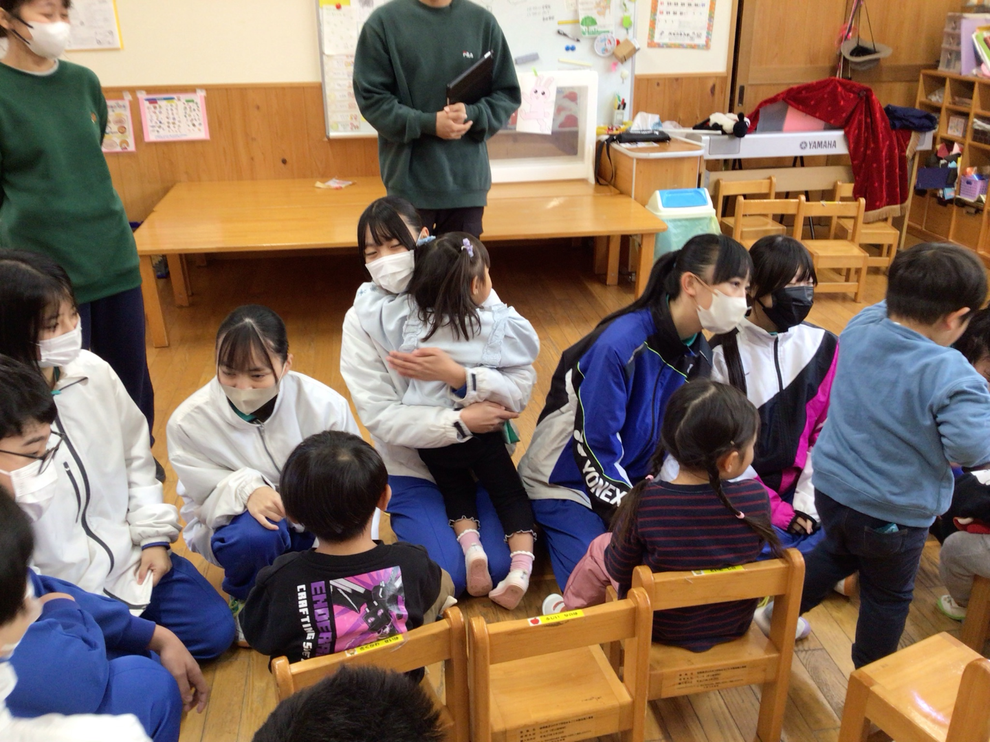 3年生保育実習 更新日:2025年12月10日 3年生が中野方こども園に出向き、保育実習を行いました。 毎年家庭科の授業の一環で取り組まれているものです。 今年は紙芝居を自作して子どもたちのまえで発表しました。