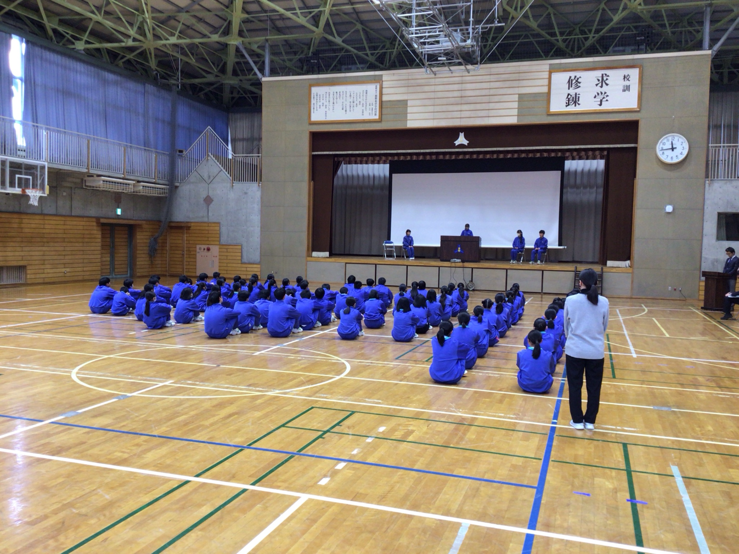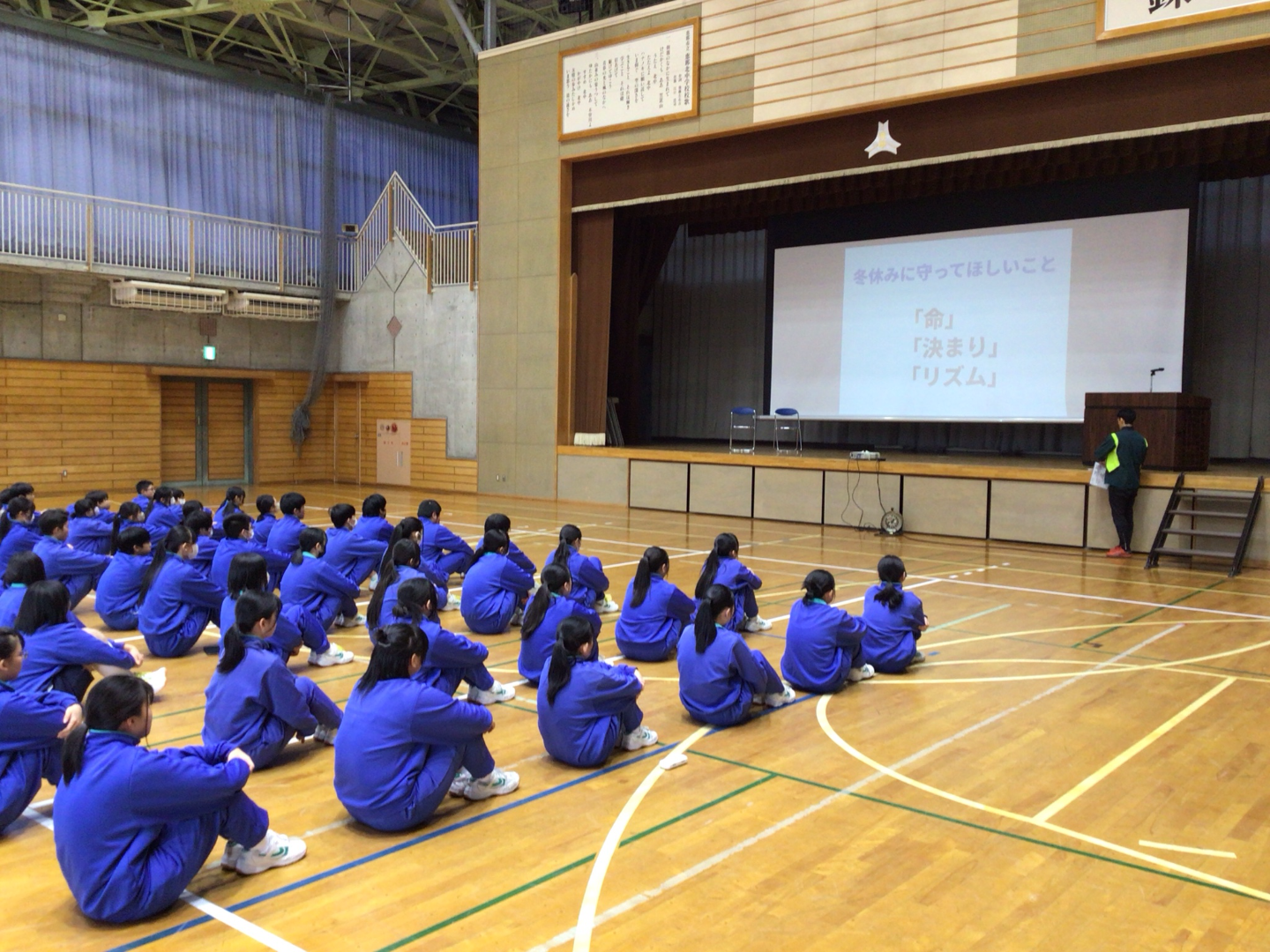 校長先生からは「当事者意識をもつ」、生徒指導主事の先生からは「冬休みに守ってほしいこと」、学年代表や生徒会長からは「4ヶ月間の成果と課題」について話がありました。いよいよ新年を迎えます。生徒の皆さんが元気で1月登校できますように。