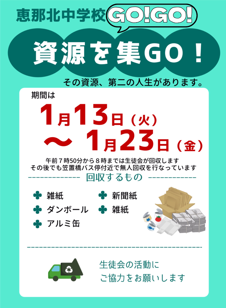 生徒会による資源回収促進運動 更新日:2025年12月27日 生徒会より地域のみなさまにお知らせします。 資源回収促進運動を行います。ポスターの通り、お持ちください。 なお、年末の大掃除ででたものについては、期間については問いません。 バス駐車場の資源回収かごにお持ちください。