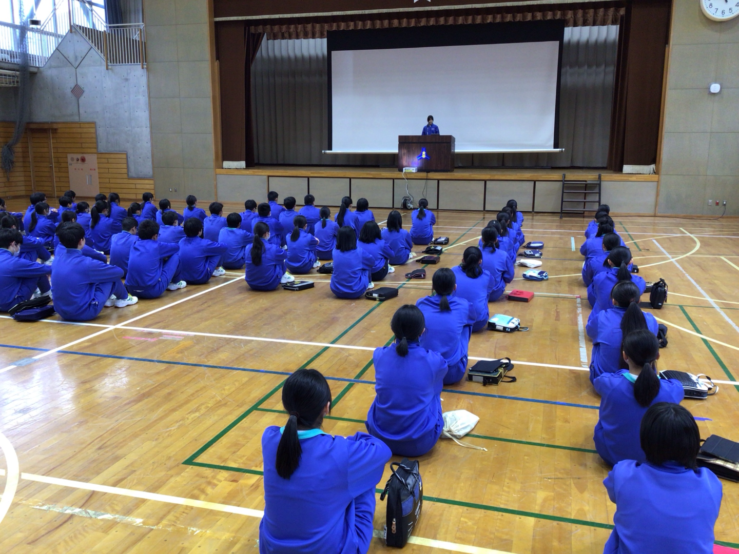 校長先生からは、今年の目標として、読書、ボランティア、自主学習を示していただきました。生徒会長からは、生徒会スローガンを確認し、残りの3ヶ月各学年何を頑張れば良いのか、指針が示されました。生徒指導の先生からは、「誇り」と「継」をキーワードに話をいただきました。