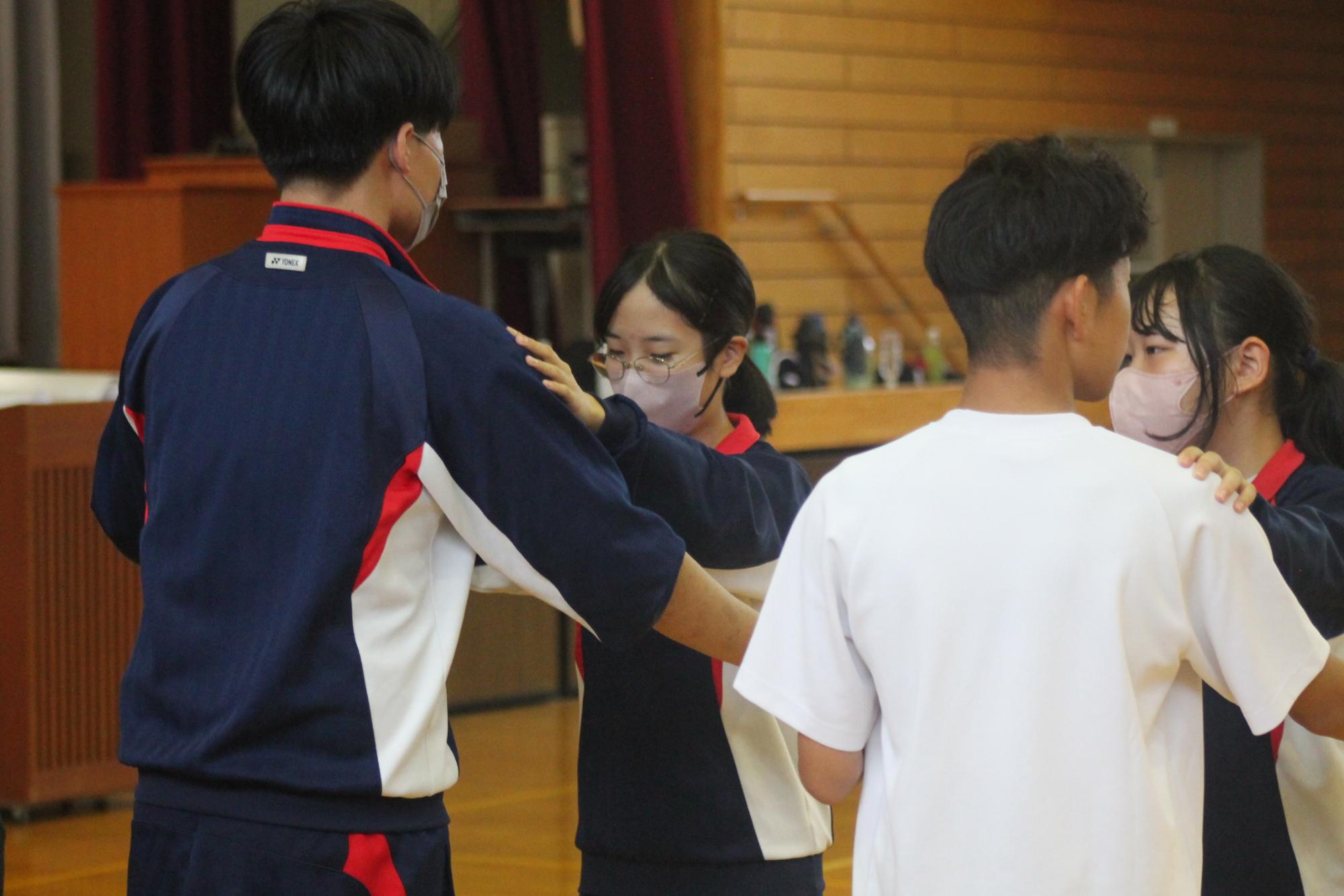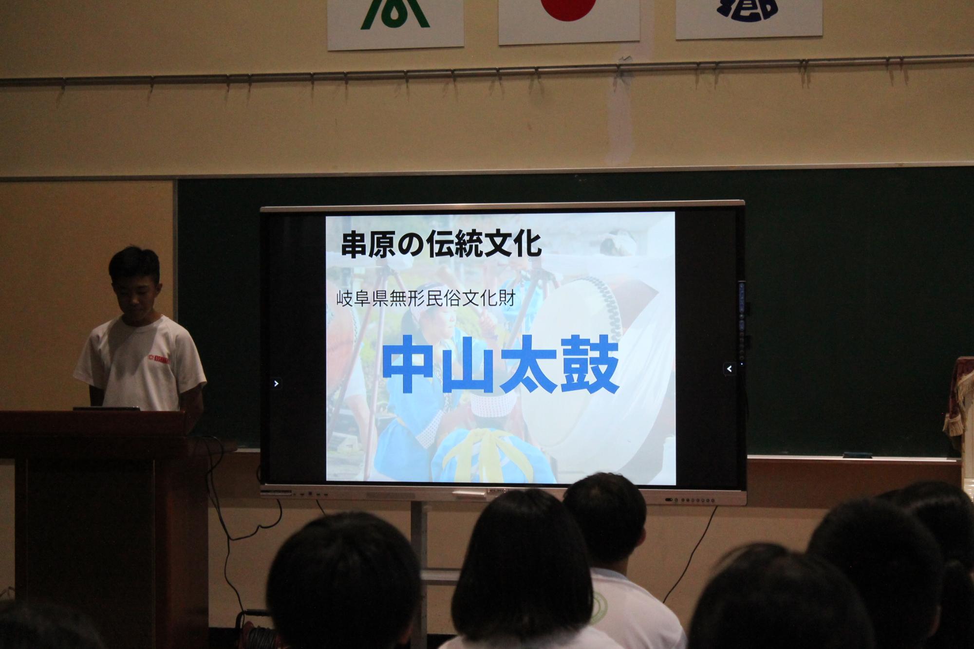 学校間交流では、御嵩町立上之郷中学校に伺いました。ドッヂボールや社交ダンスを行い交流しました。また串原中学校は上之郷中学校の生徒へ中山太鼓について紹介しました。上之郷中学校からは合唱を披露していただきました。