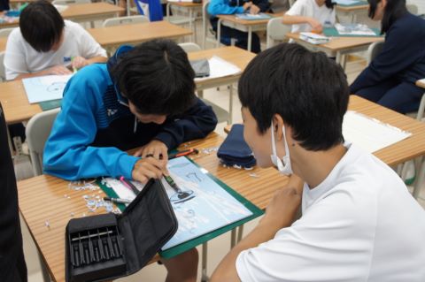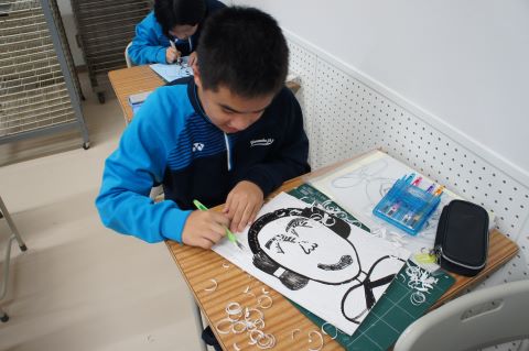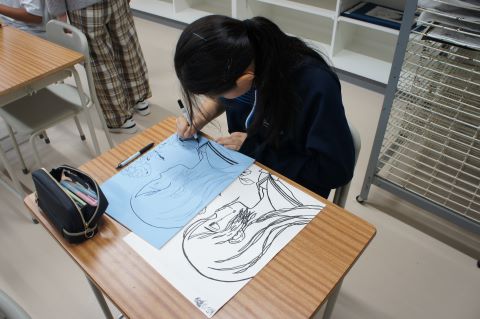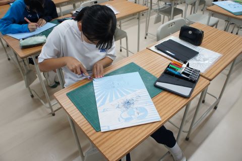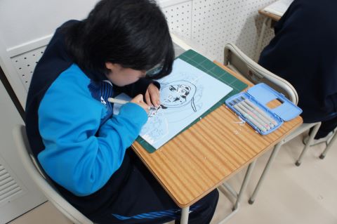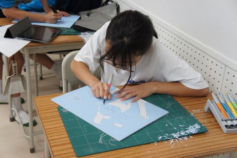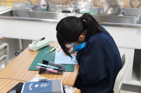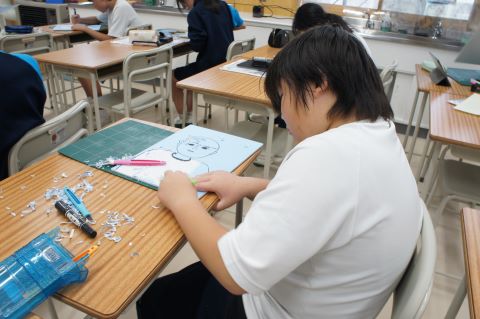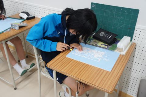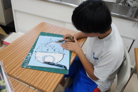 版に自分の書いた絵を写し、彫刻刀で掘り進めていきます。