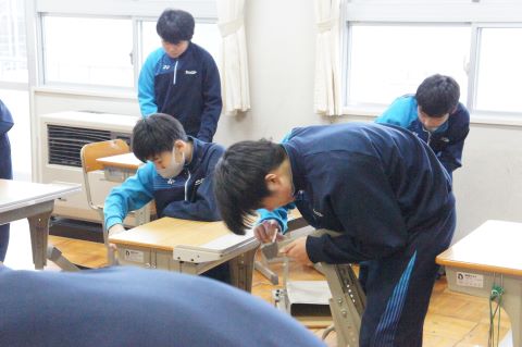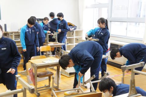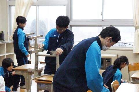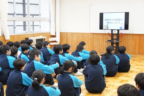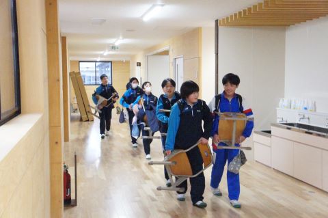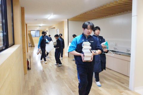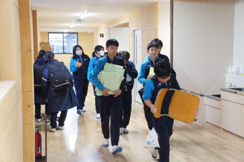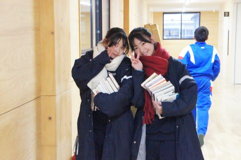 新校舎での過ごし方の集会のあと、いよいよピカピカの新校舎へ、机や教室の備品を引っ越します!