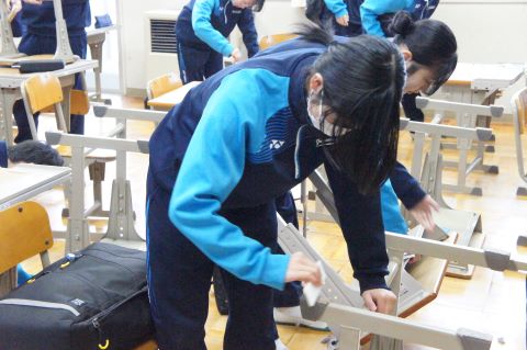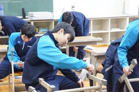 机や椅子のごみを丁寧に落として、準備をしていきます。