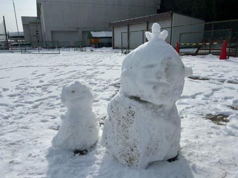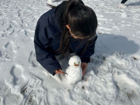 近くから木の枝や葉を集めて、顔も作っていました。かわいい雪だるまの完成です。