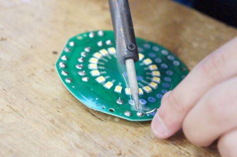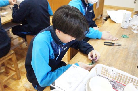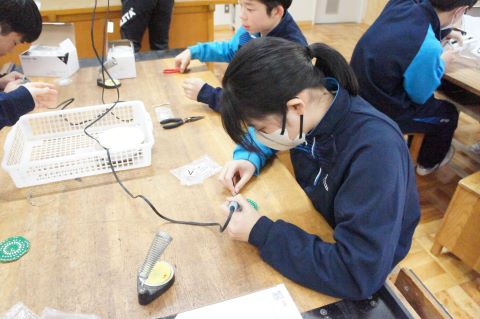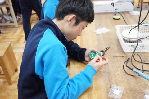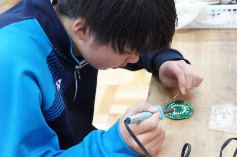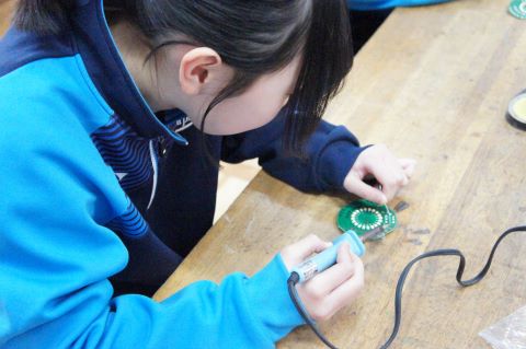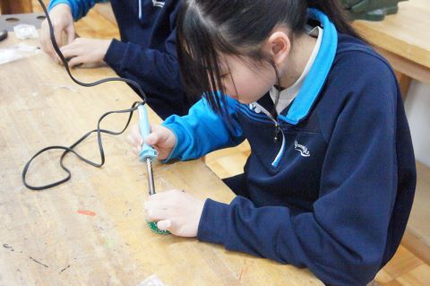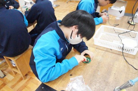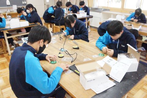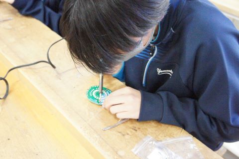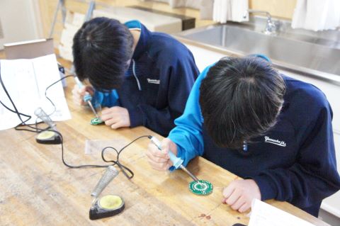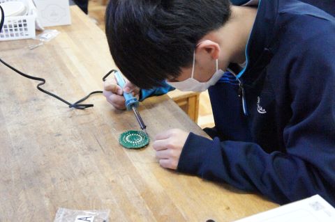 2年生は、はんだごてを使用して照明付きのBluetoothスピーカーを作成しています。