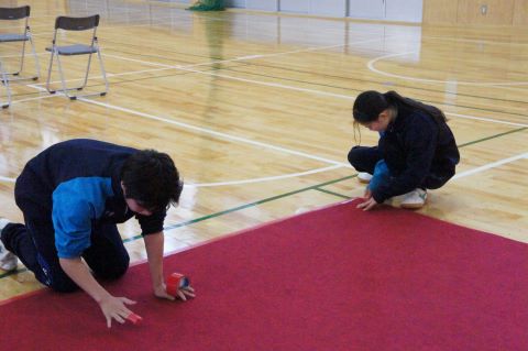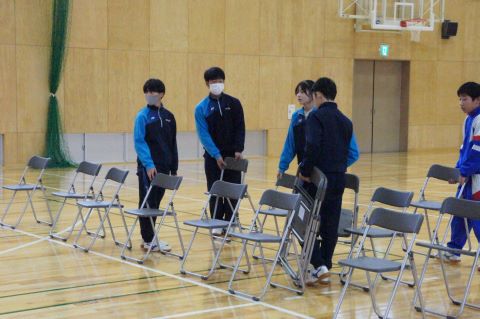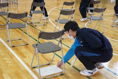 椅子の配置チーム。ます目に合わせて並べていきます。まっすぐにそろっているのか、幅は適切か、何度も見ながら調整する姿がありました。