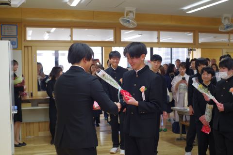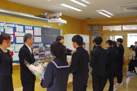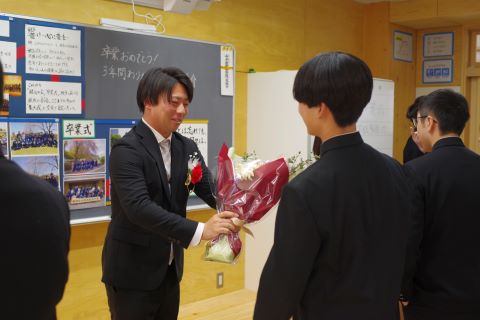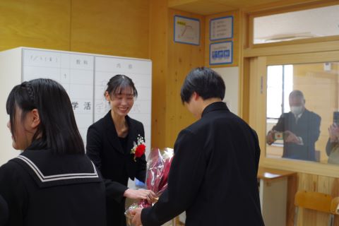 生徒から3年生の職員への花束を。そして生徒一人ひとりから担任の先生へ花束を。
