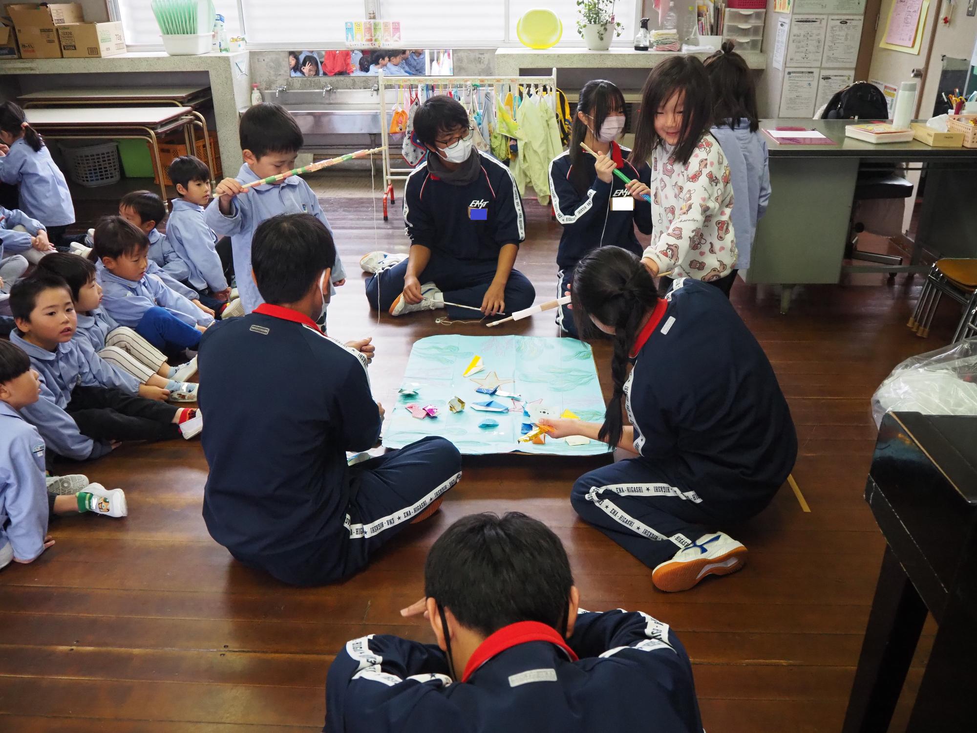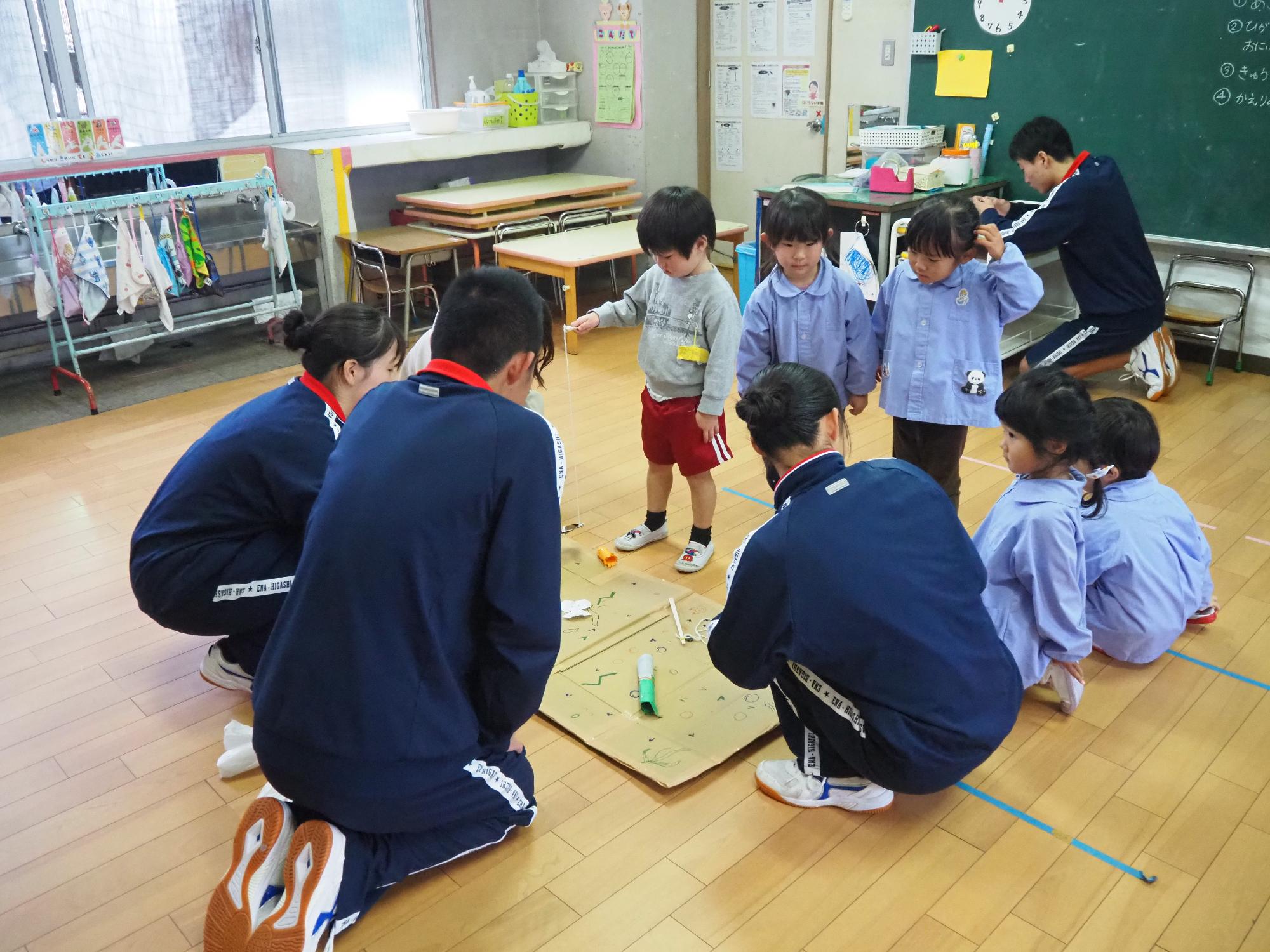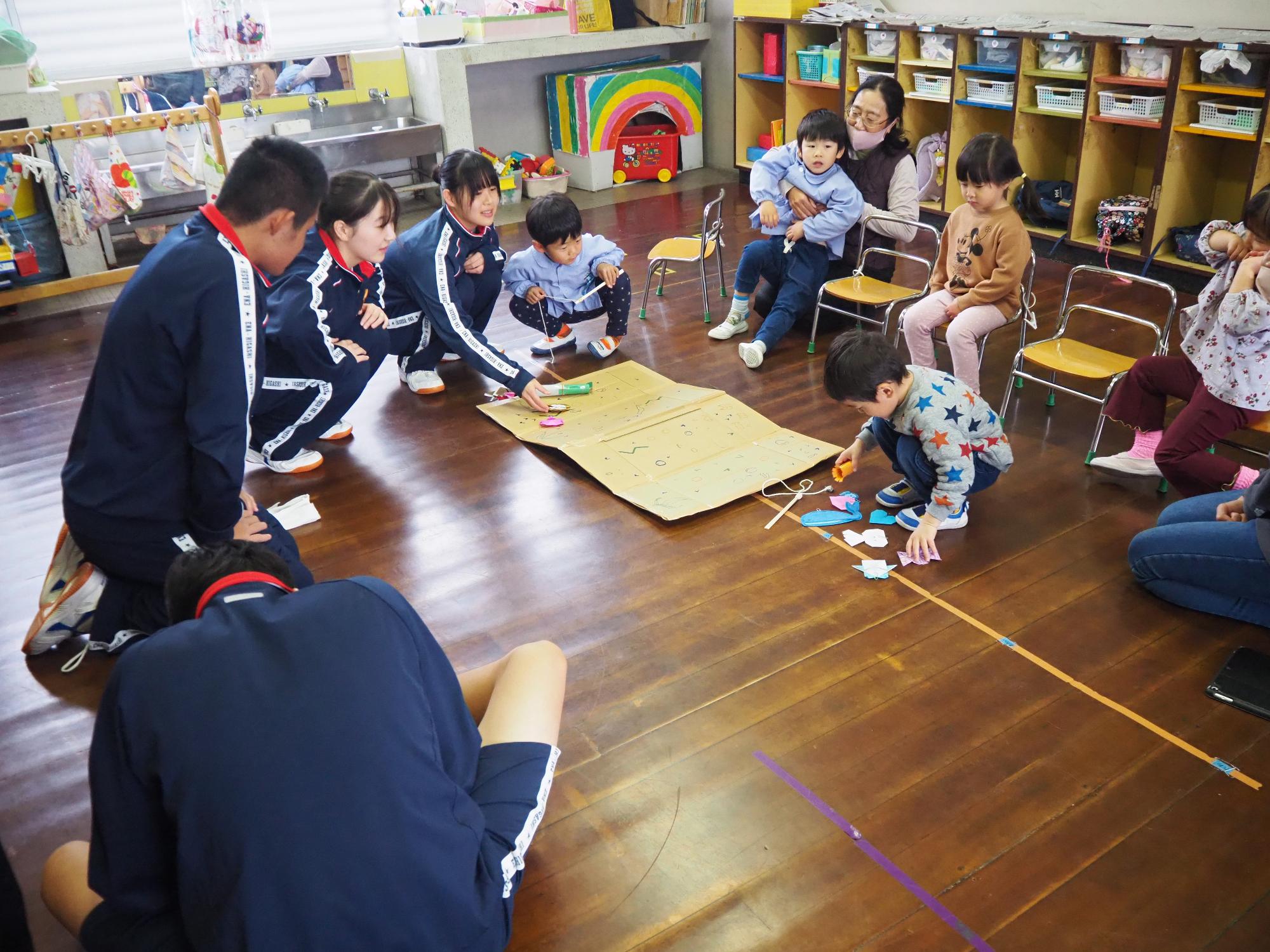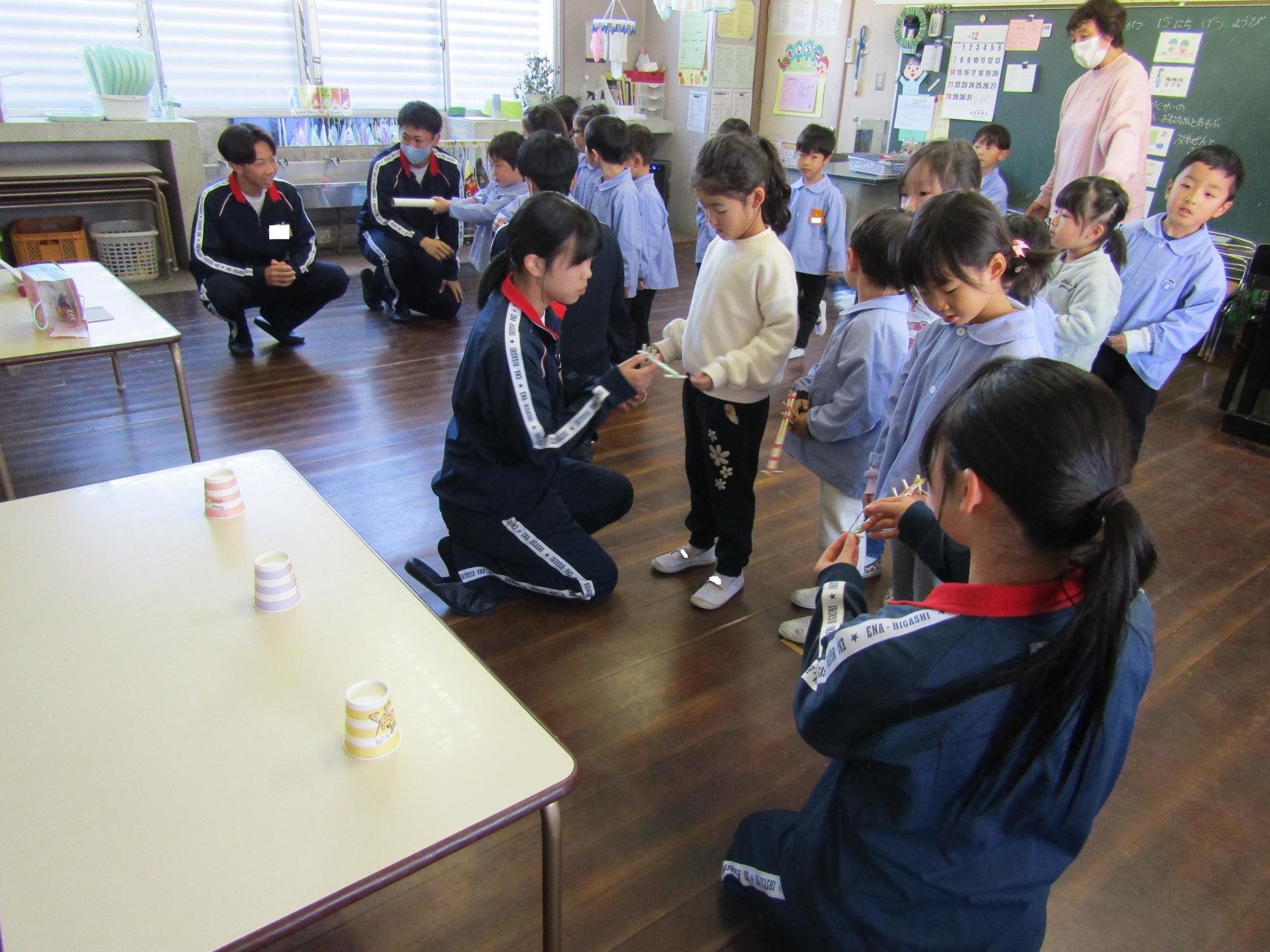 子ども達が喜びそうなおもちゃを考えて作ってきてくれ、グループに分かれ各クラスで一緒に遊びました。