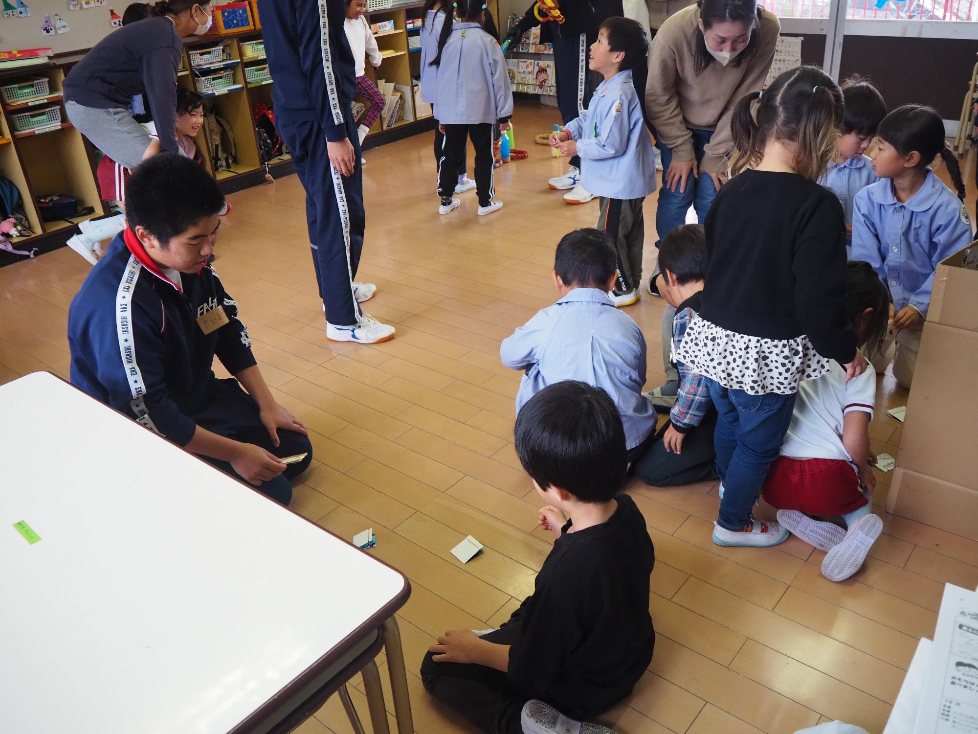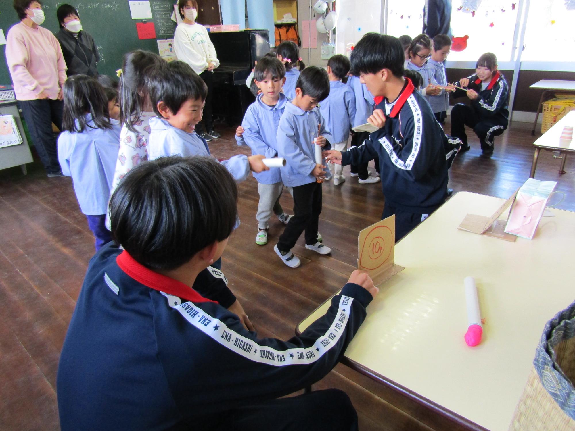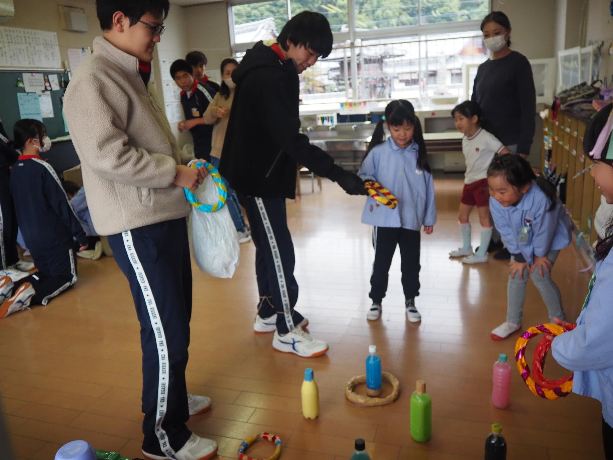 子ども達が喜びそうなおもちゃを考えて作ってきてくれ、グループに分かれ各クラスで一緒に遊びました。
