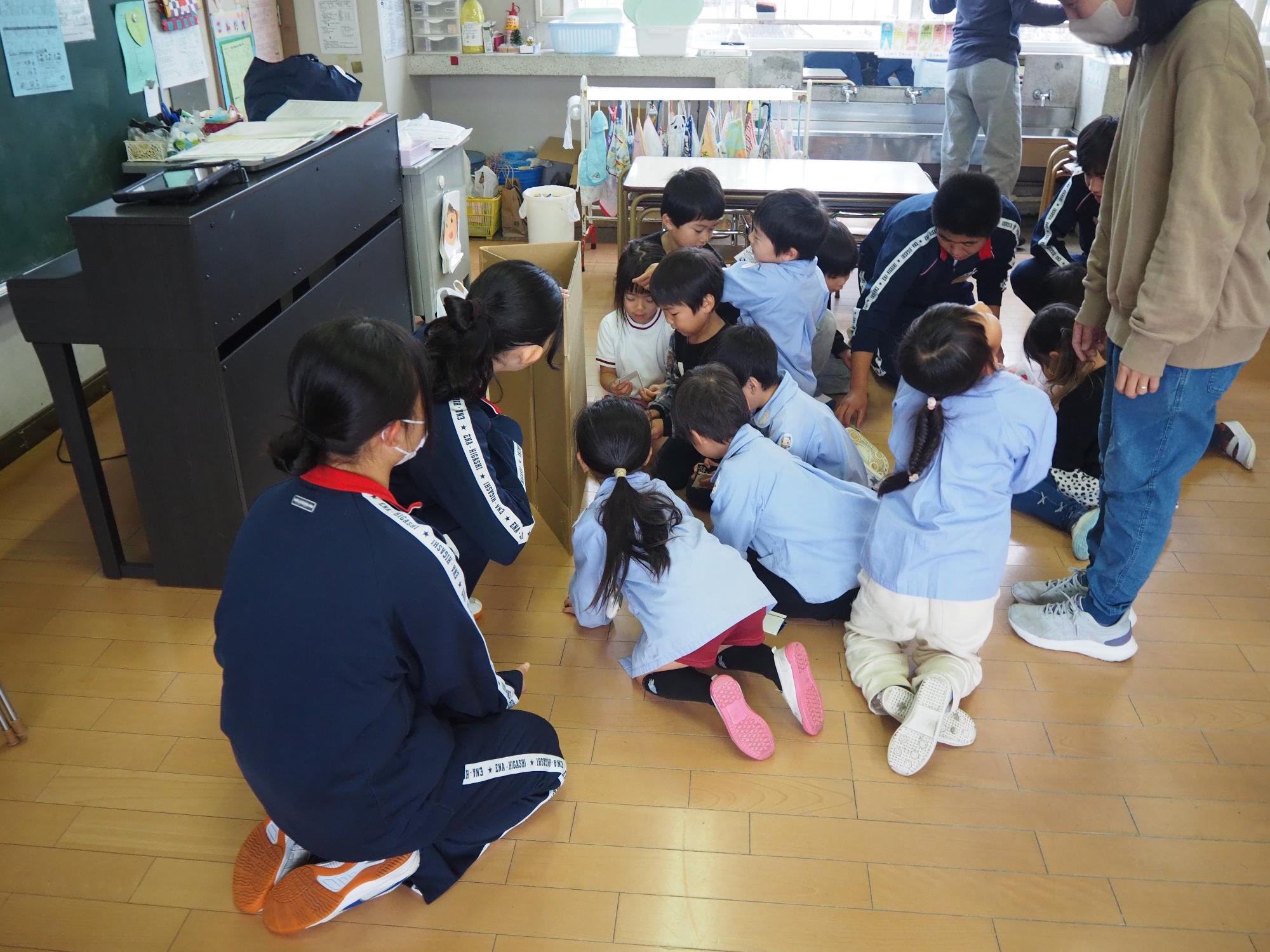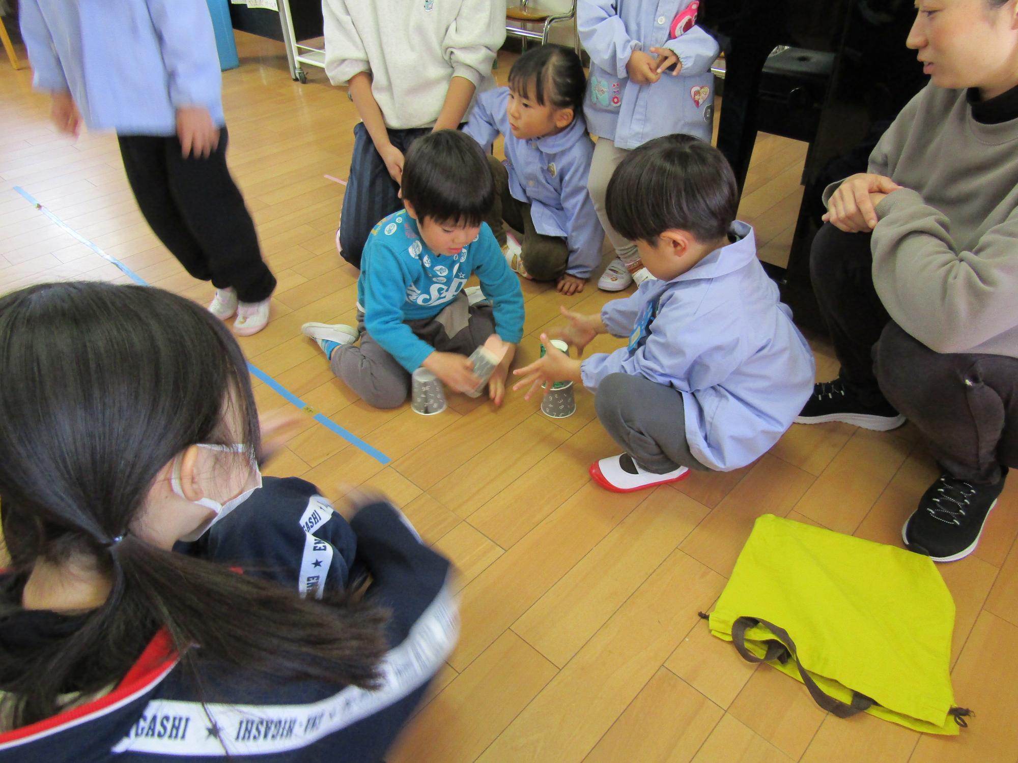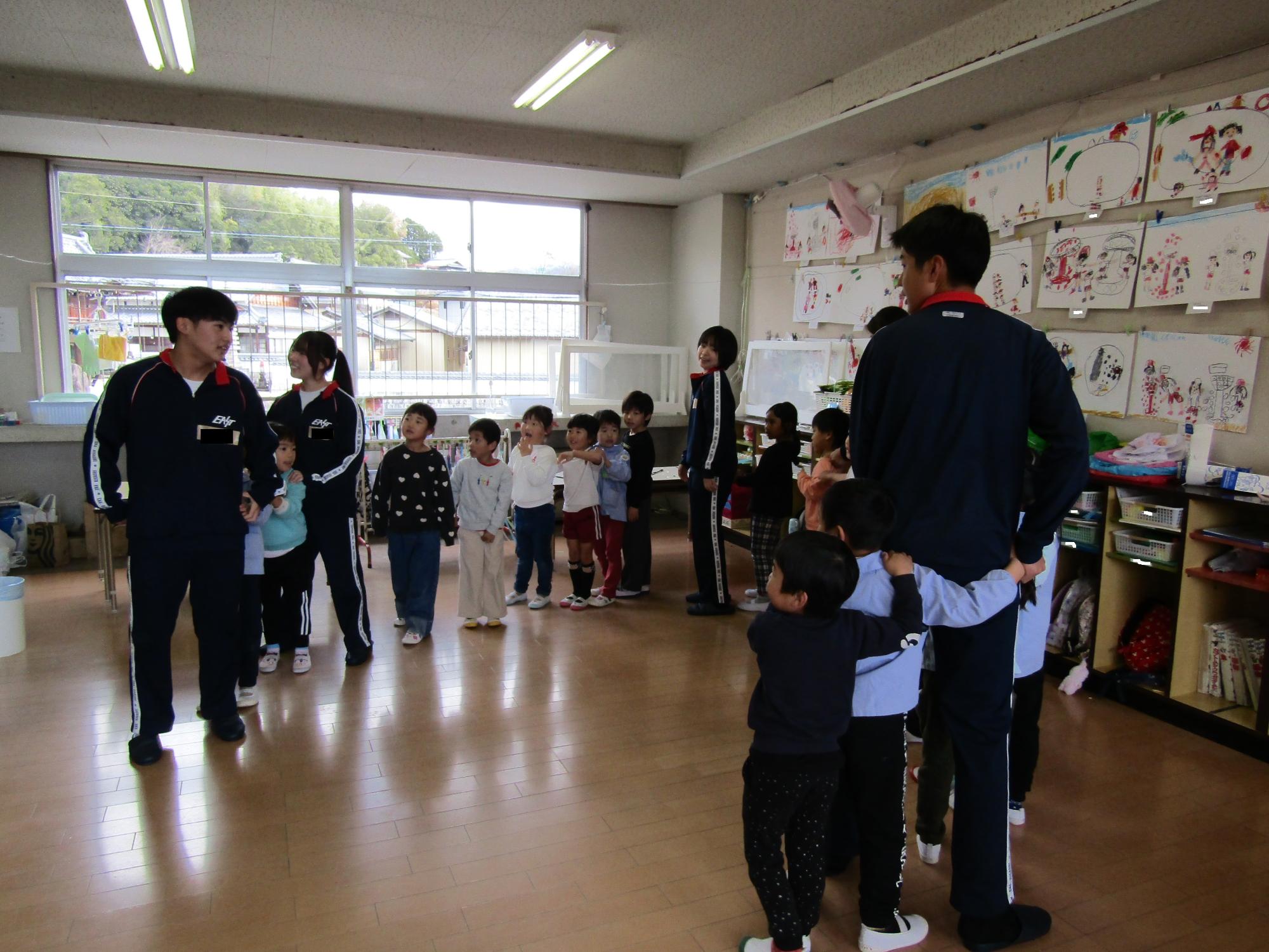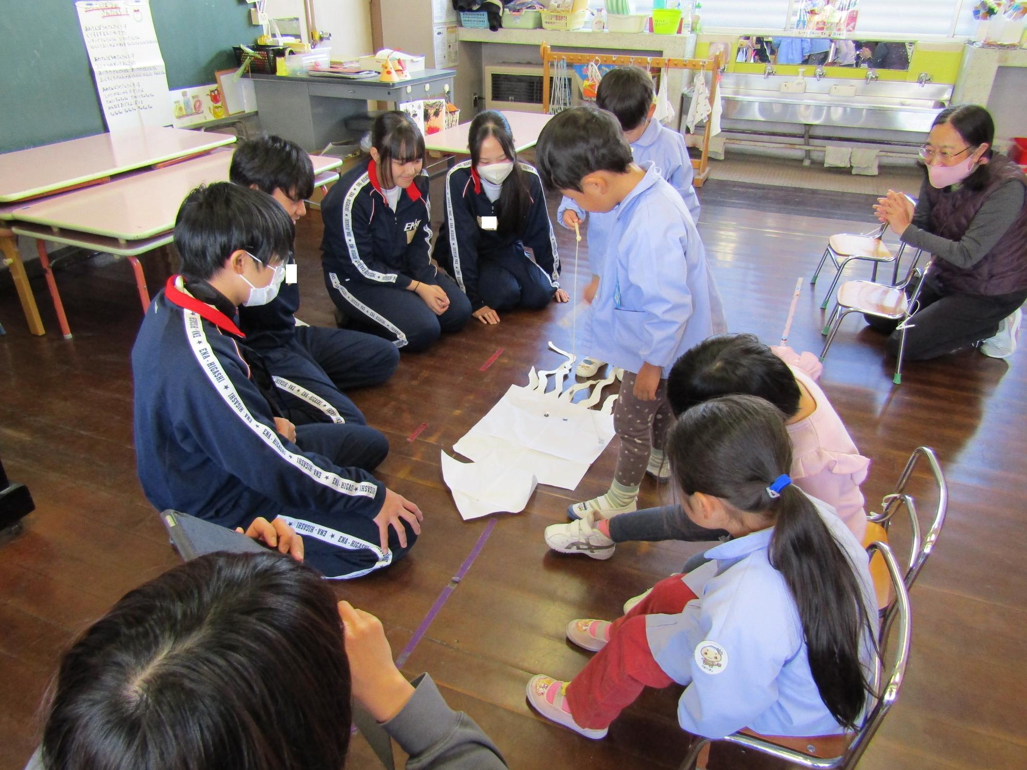 子ども達が喜びそうなおもちゃを考えて作ってきてくれ、グループに分かれ各クラスで一緒に遊びました。