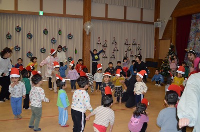 まずはみんなで「サンタ・トナカイ・雪だるま」「ジングルベル」を踊りました。クリスマスの雰囲気にみんなノリノリでした。
