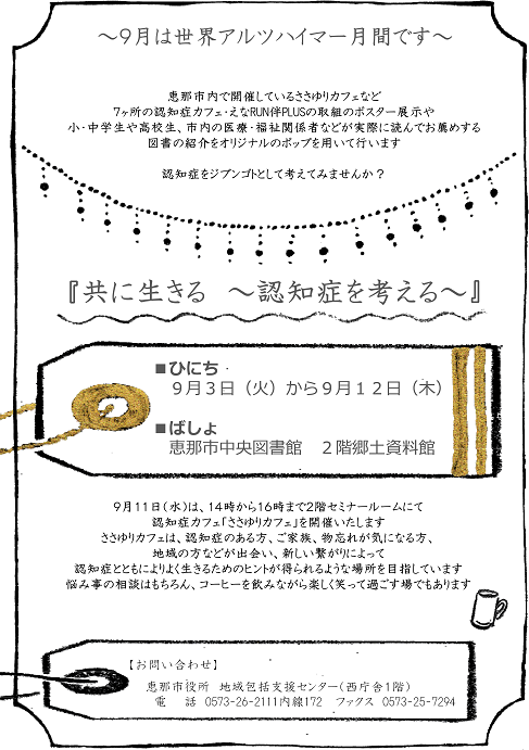 令和元年度 第4回ふるさとギャラリー 共に生きる~認知症を考える~ 更新日:2020年03月24日 開催日時 2019年9月3日(火曜日)から2019年9月12日(木曜日)まで 概要 恵那市内で開催しているささゆりカフェなど7ヶ所の認知症カフェ・えなRUN伴PLUSの取組のポスター展示や小・中学生や高校生、市内の医療・福祉関係者などが実際に読んでお薦めする図書の紹介をオリジナルのポップを用いて行います。認知症をジブンゴトとして考えてみませんか? この記事に関するお問い合わせ先 中央図書館〒509-7205岐阜県恵那市長島町中野二丁目2番地5電話番号:0573-26-6923ファクス:0573-25-7036